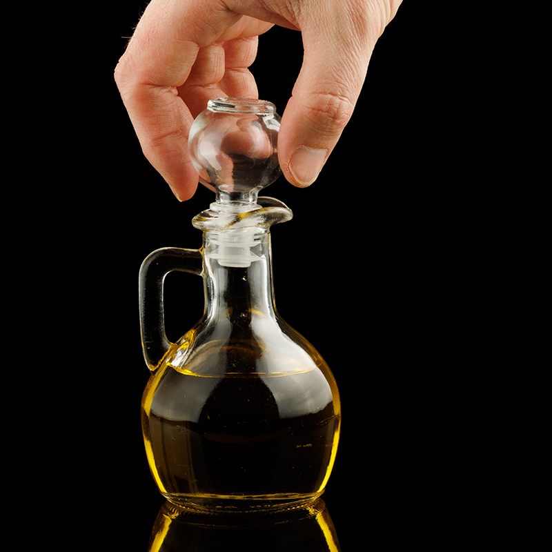 Versa circa 20 ml di olio in un bicchiere di vetro scuro.