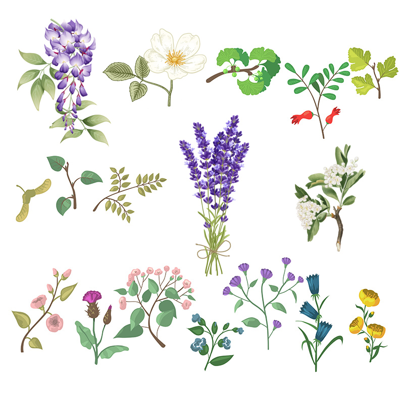 biancospino, glicine, lavanda, camomilla, giglio, rosa canina.