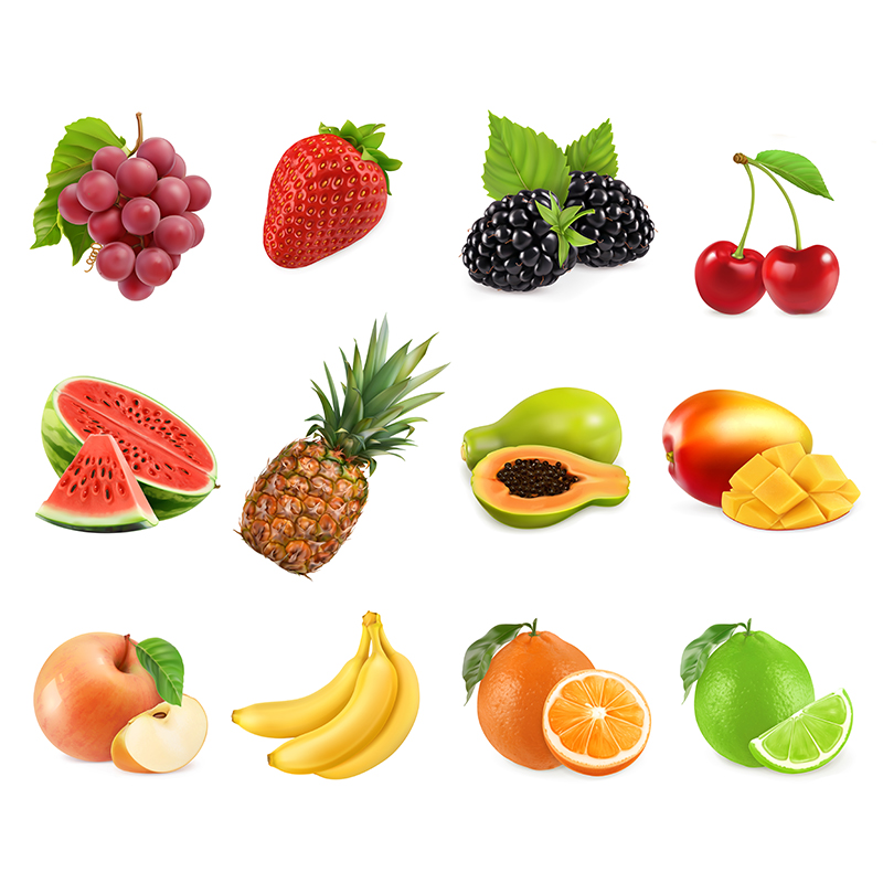 banana, ananas, mela verde, pera, pesca, limone, arancio, mandarino, mandorla, noce, nocciola, pinolo.