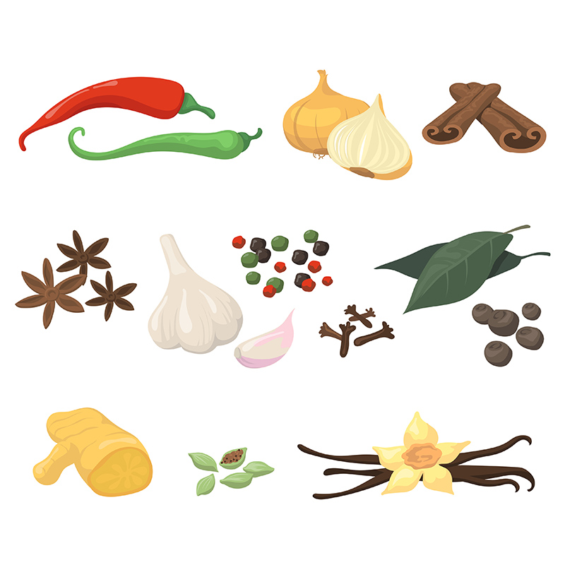 cannella, pepe bianco, pepe verde, pepe nero, peperoncino, vaniglia, noce moscata, zenzero.