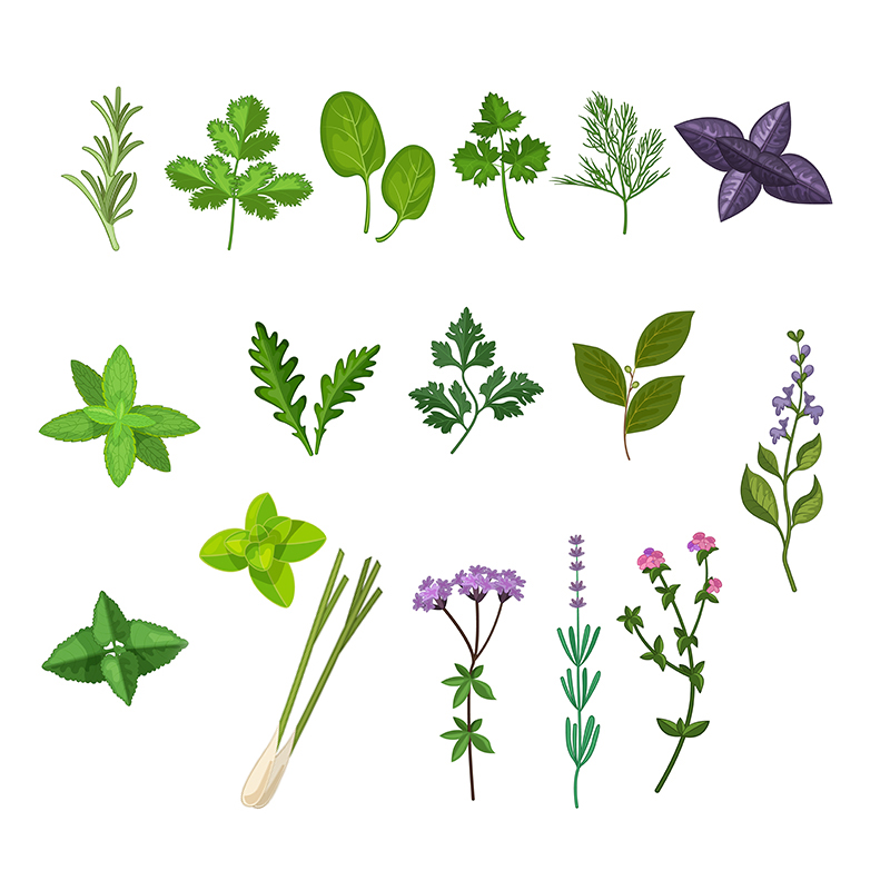 timo, menta, rosmarino, maggiorana, salvia, basilico, alloro, origano.