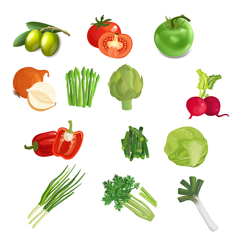 oliva fresca, carciofo, peperone, pomodoro verde, cicoria, cardo, finocchio, lattuga, rucola, sedano, erba tagliata, foglia di pomodoro, fieno fresco.